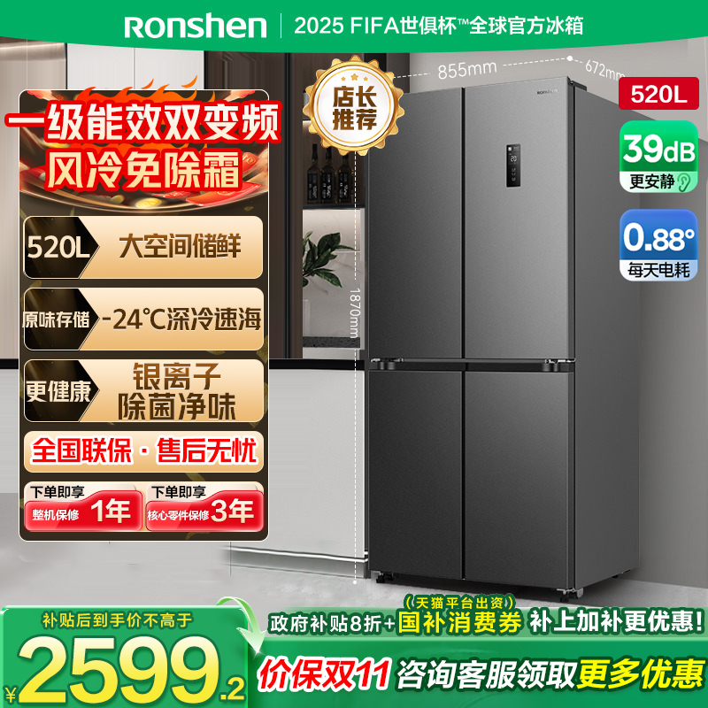容声520L十字四门对开电冰箱一级能效变频大容量风冷无霜政府补贴