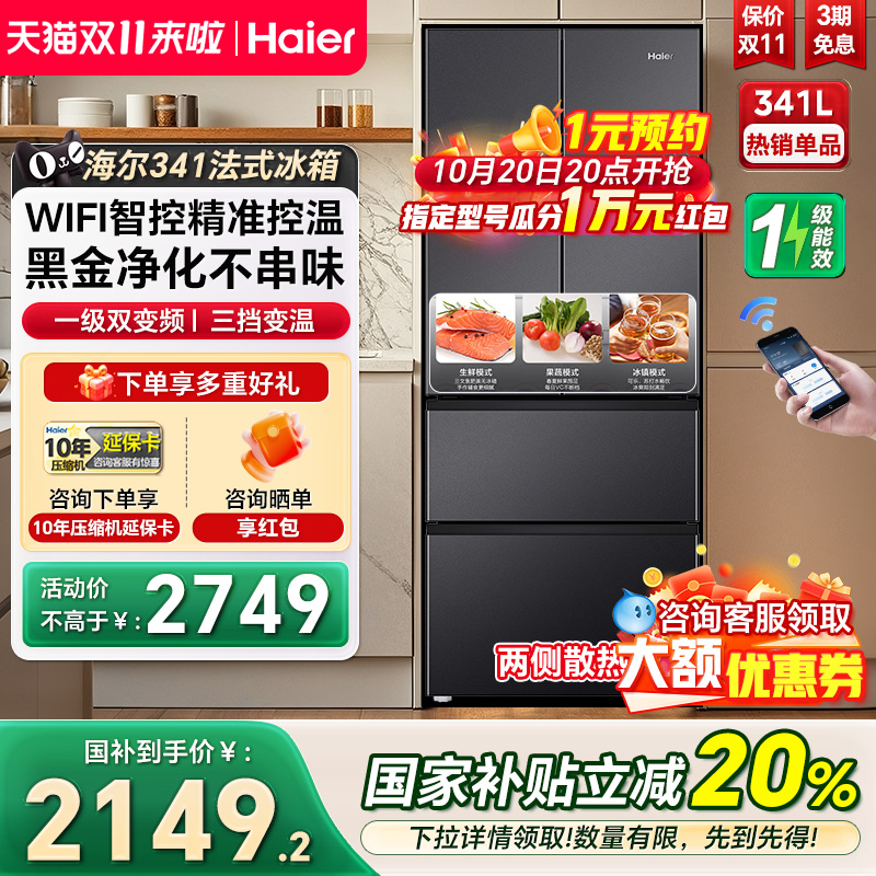 海尔冰箱341L法式双开四门小冰箱一级节能风冷变频超薄家用电冰箱