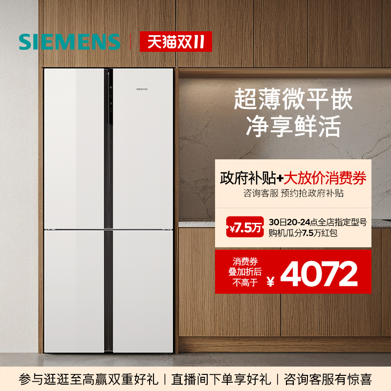 【镇店爆款】西门子超薄十字星497L玻璃四门嵌入式冰箱一级能效