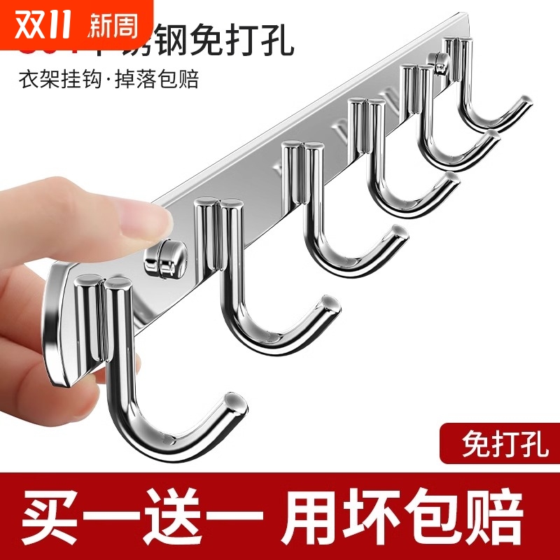挂钩壁挂墙壁不锈钢衣帽架毛巾衣服排钩厨房粘勾浴室免打孔挂衣钩
