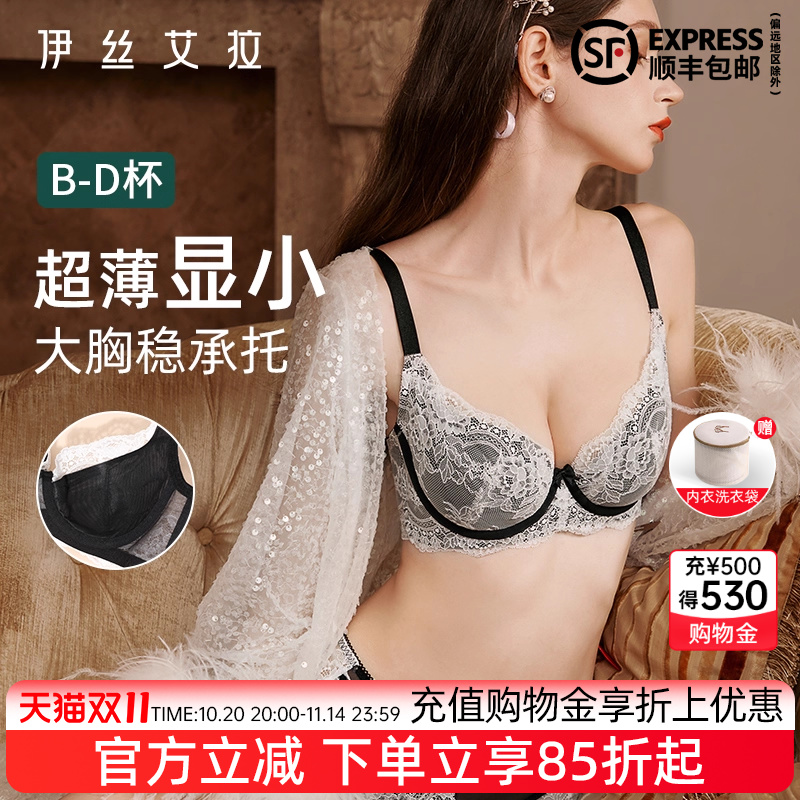 伊丝艾拉大胸显小胸内衣套装女士薄款性感蕾丝聚拢防下垂黑色文胸