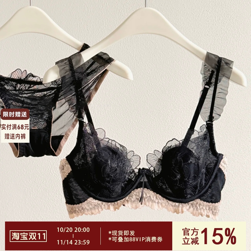 维多利亚多培尔超薄款性感内衣女黑色蕾丝大胸显小防下垂文胸套装