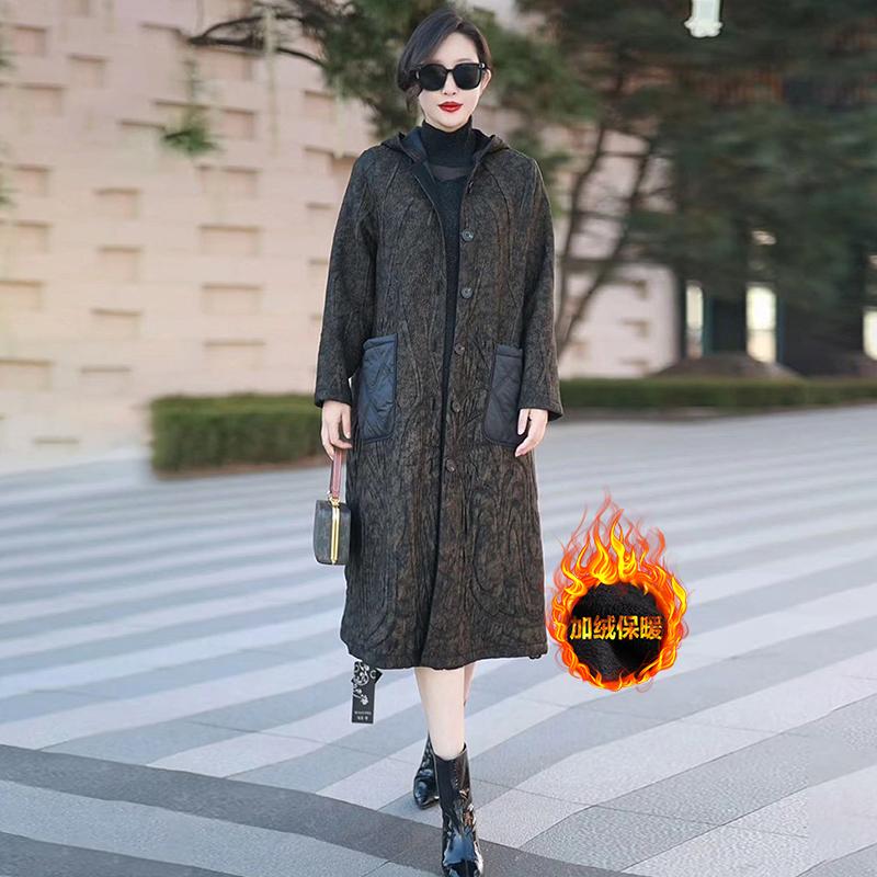 高档妈妈装加绒外套冬季新款连帽宽松大码风衣保暖长款复古大衣女