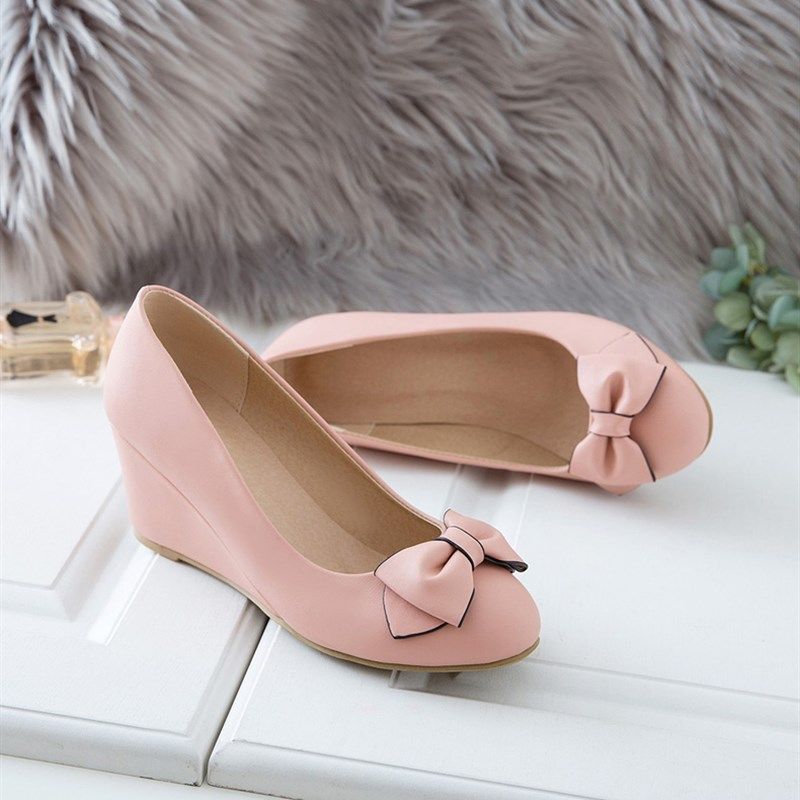 甜美坡跟单鞋蝴蝶结2021春秋季新款浅口中跟女鞋圆头高跟百搭鞋子