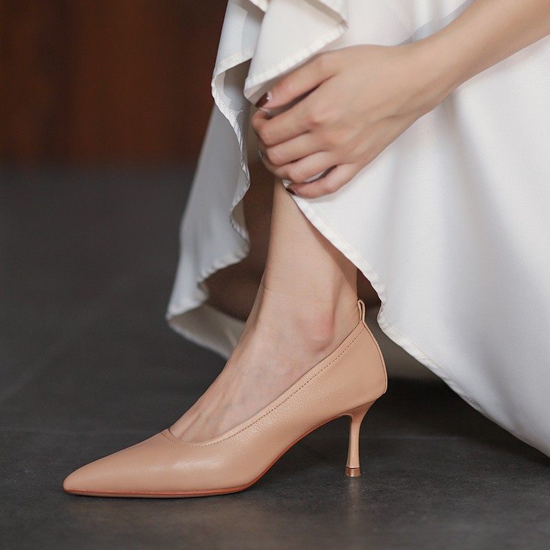羊皮尖头法式绝美气质单鞋女士百搭真皮小猫跟中跟浅口通勤小皮鞋