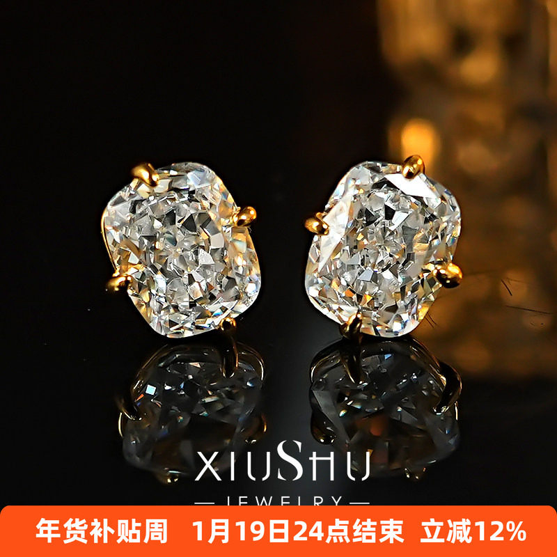 轻奢简约大气雷迪恩碎冰切925银耳钉镶嵌高碳钻肥长方气质百搭女