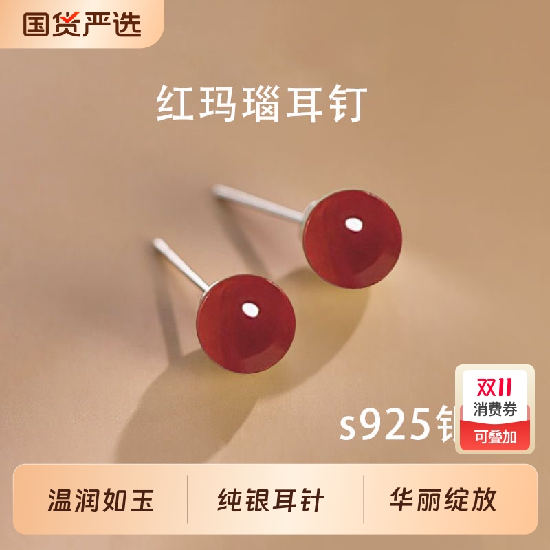 天然红玛瑙s925银耳钉新年红色简约百搭耳骨钉防过敏龙本命年耳饰