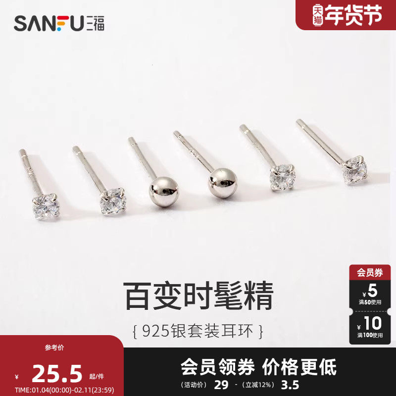三福925银耳钉套装耳骨钉耳饰耳环高级感时尚简约百搭女精致3对
