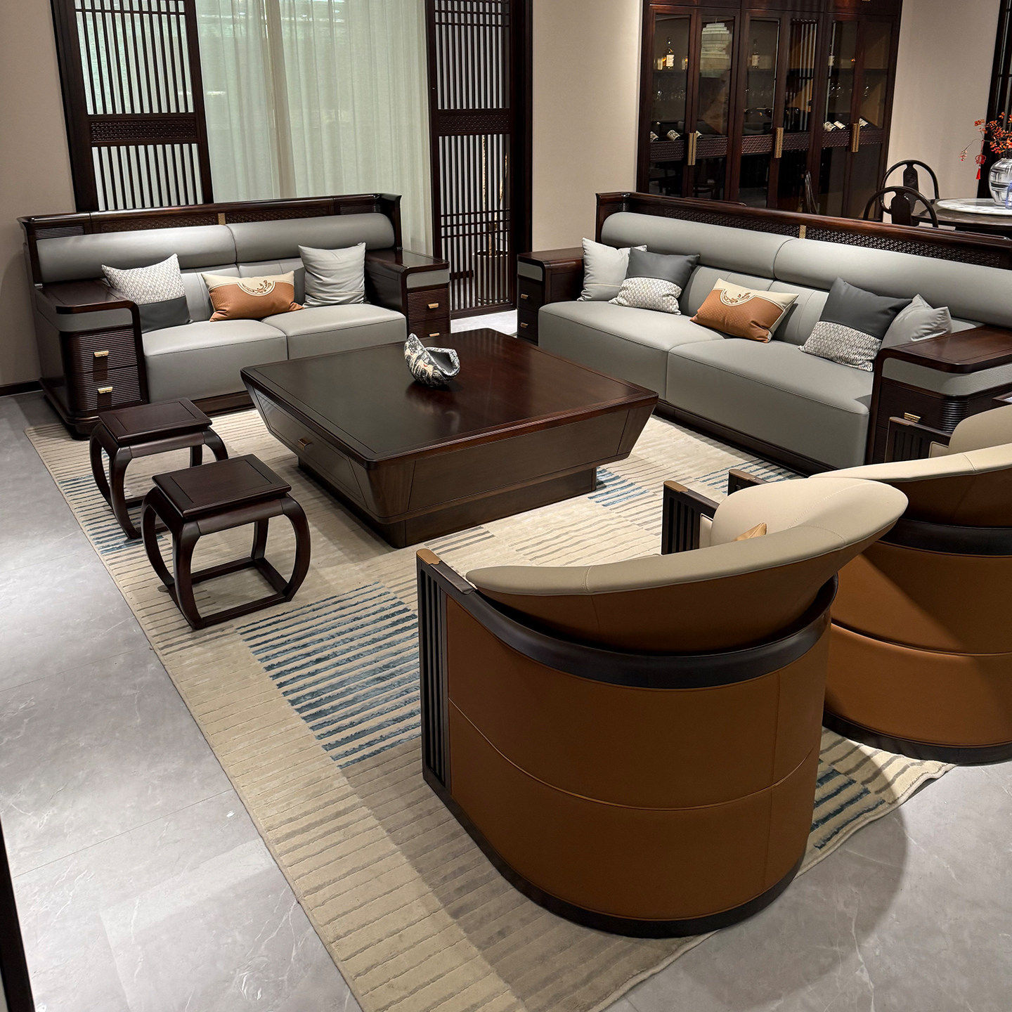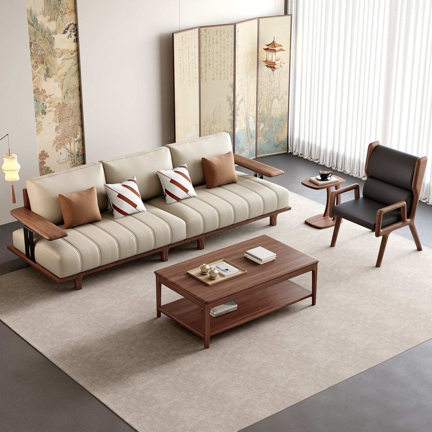 宋式美学实木沙发客厅简约现代真皮沙发黑胡桃禅意新中式沙发组合