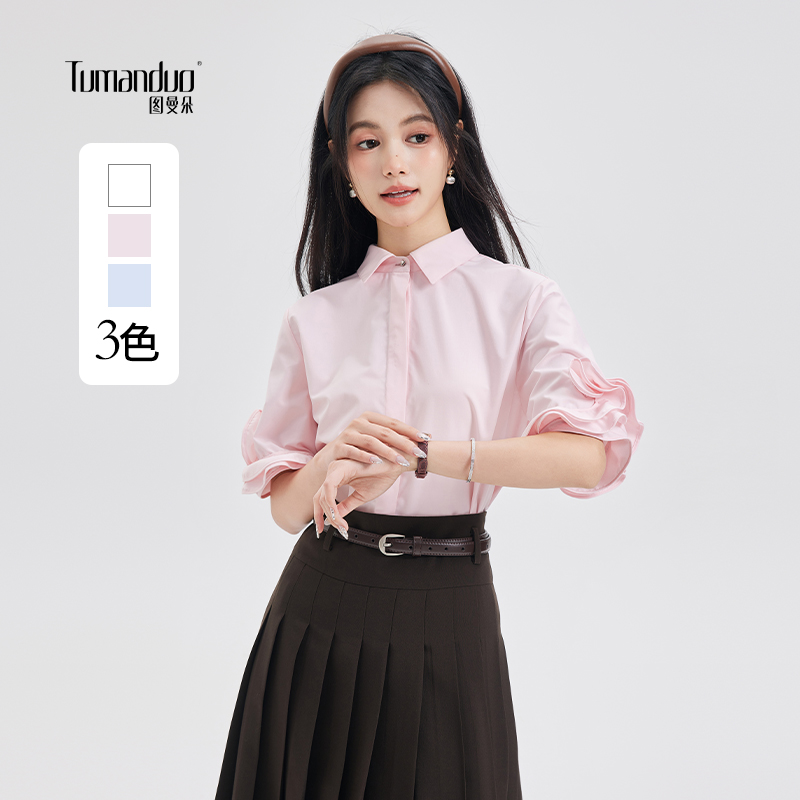 图曼朵温柔通勤粉色花瓣短袖衬衫女生高级设计感教资职场正装衬衣