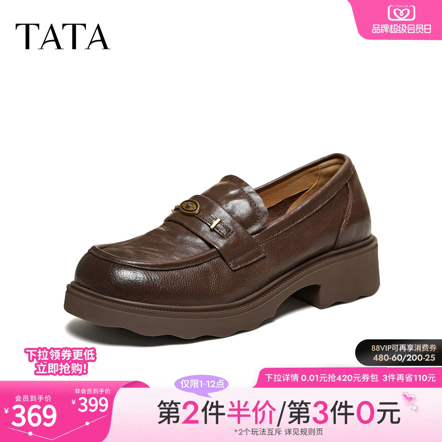TATA他她菁英粗跟小皮鞋女复古真皮棕色乐福鞋女2026新款JZY01AA6