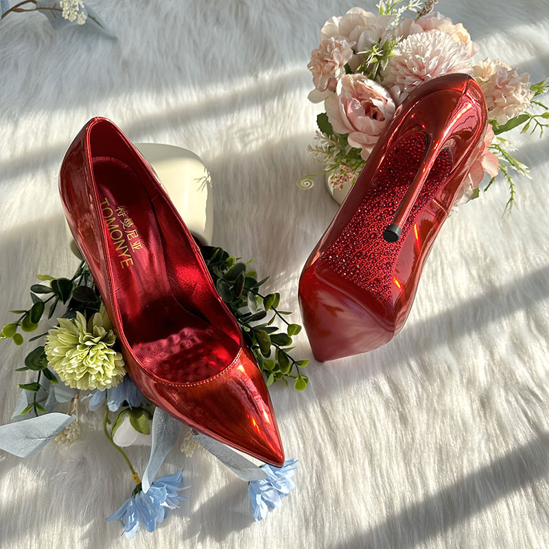 2025早春新款尖头亮片红色婚鞋水晶高跟新娘鞋细跟浅口水钻单鞋女