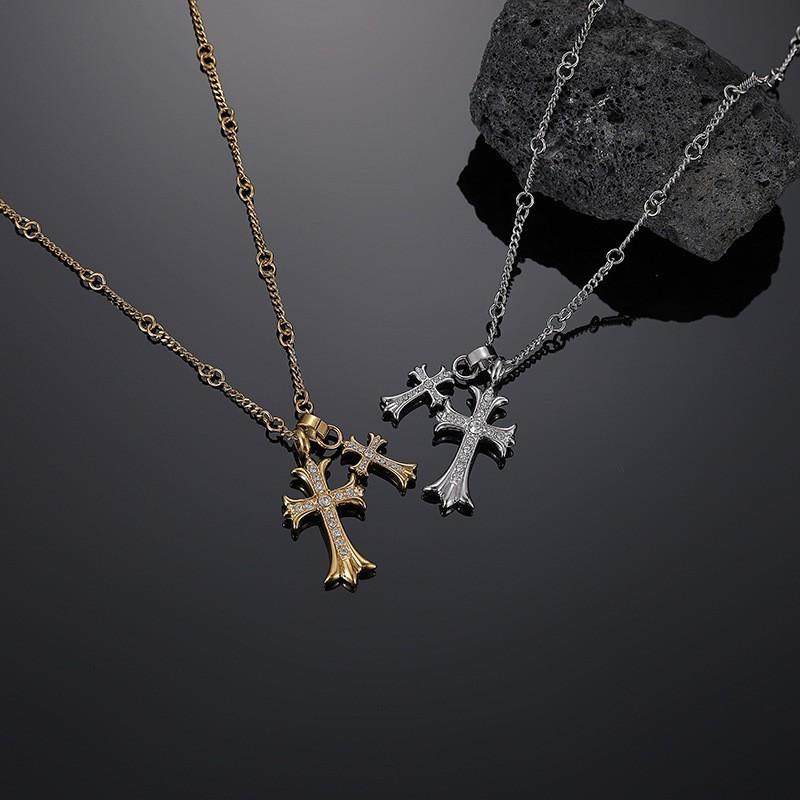 潮牌嘻哈24k镀金双十字架镶钻项链男女同款易梦玲同款锁骨毛衣链