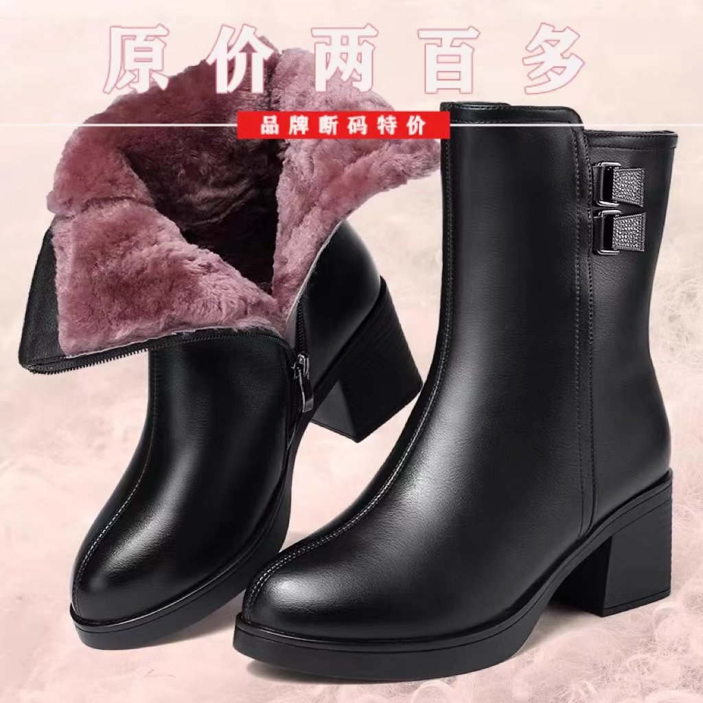 断码特价全牛皮真皮冬季保暖短靴加绒加厚棉靴中年妈妈粗跟中筒靴