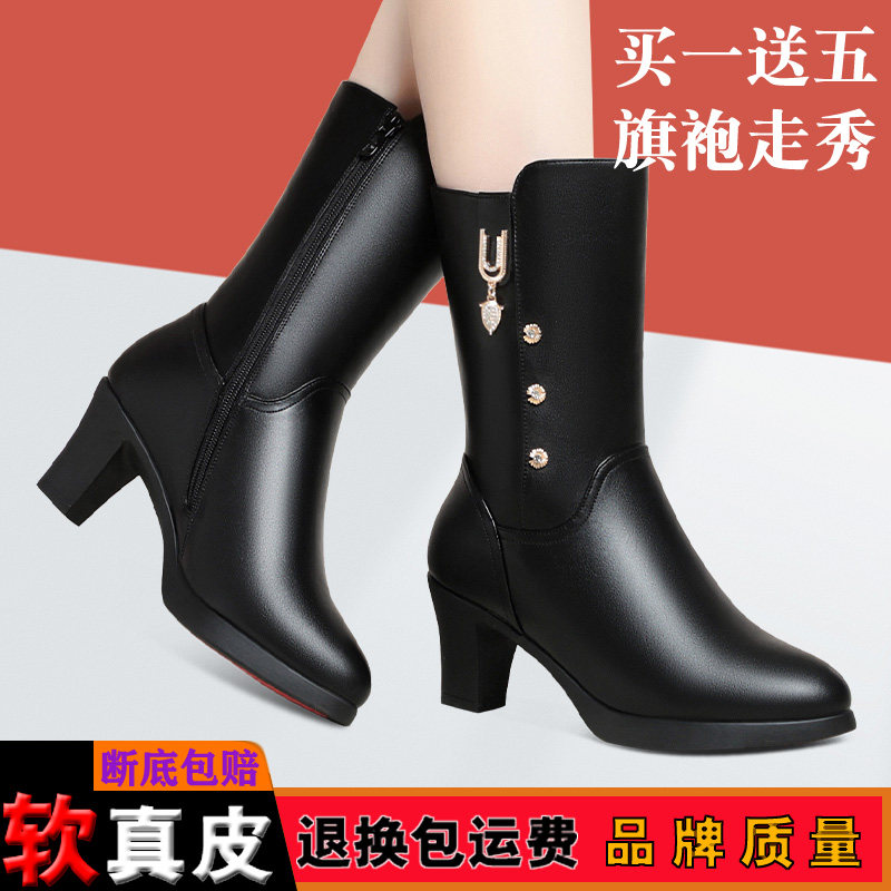 妈妈鞋子女新款中筒靴中年女靴气质高跟靴时装靴加绒皮鞋妈妈棉靴