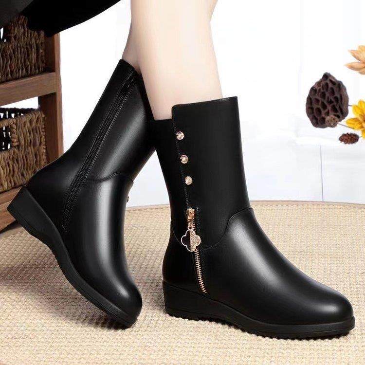 妈妈鞋子秋冬季棉靴中跟加绒加厚真皮保暖中年中老年女士中筒靴子