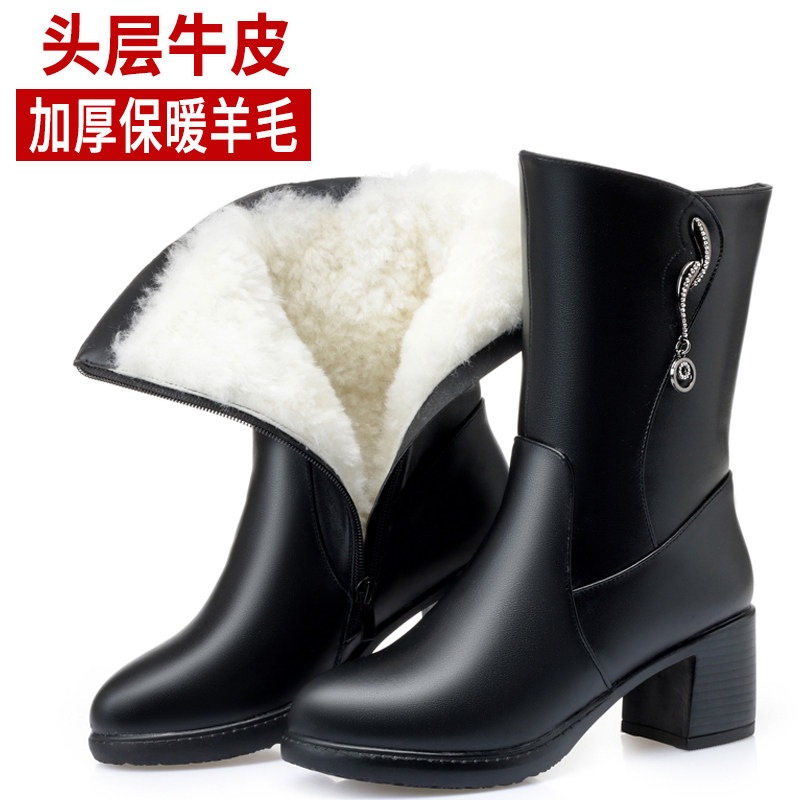 冬季羊毛女靴高跟真皮中筒靴女粗跟中年加厚棉鞋大码棉靴加绒保暖
