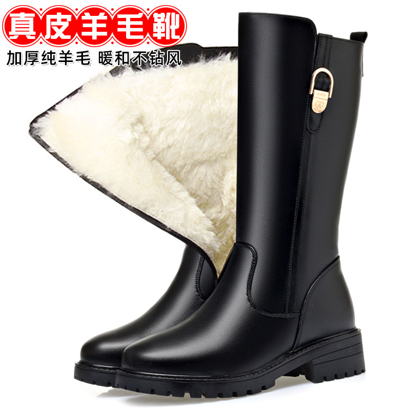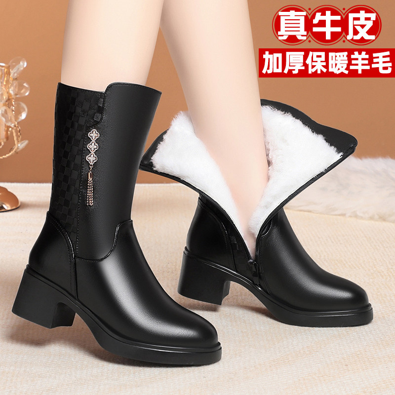 高跟真皮靴子女长筒靴冬季加绒羊毛大棉靴中年女士妈妈长靴中筒靴