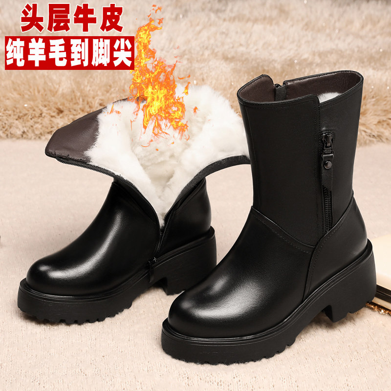 真皮羊毛中筒靴女鞋冬加绒加厚底短靴粗跟雪地靴中年妈妈棉鞋大码