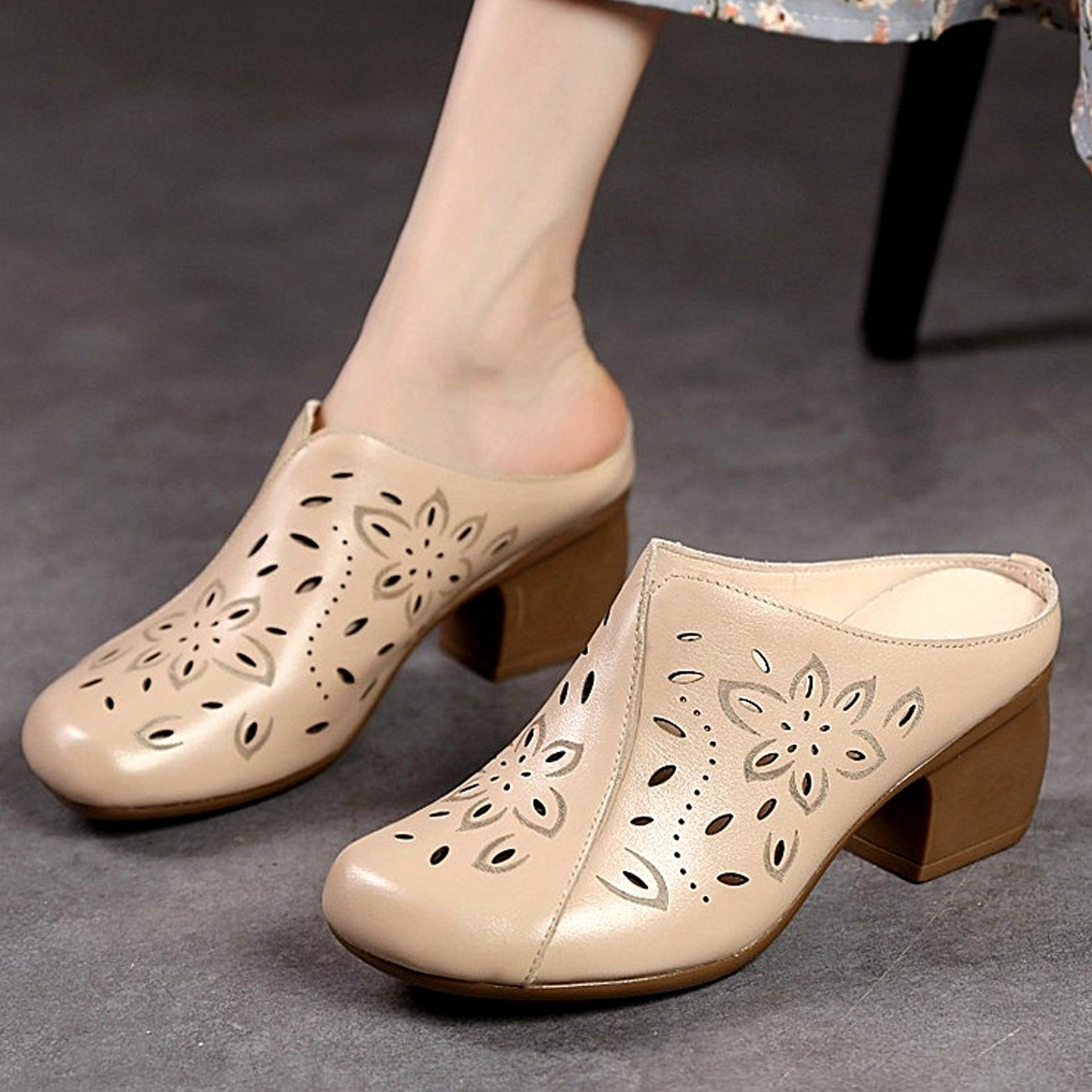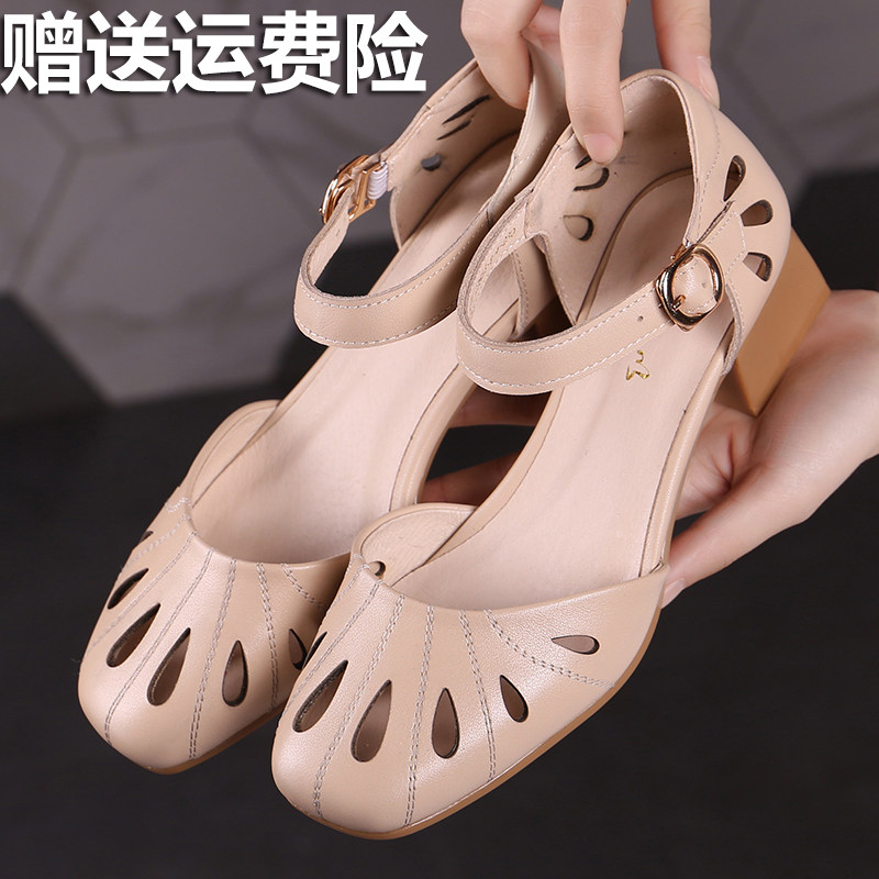 包头镂空真皮软底半拖鞋女中跟外穿舒适中年女妈妈夏天凉拖鞋防滑