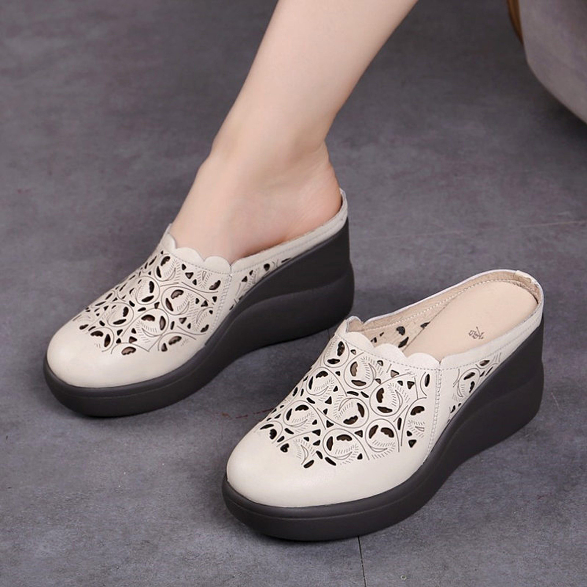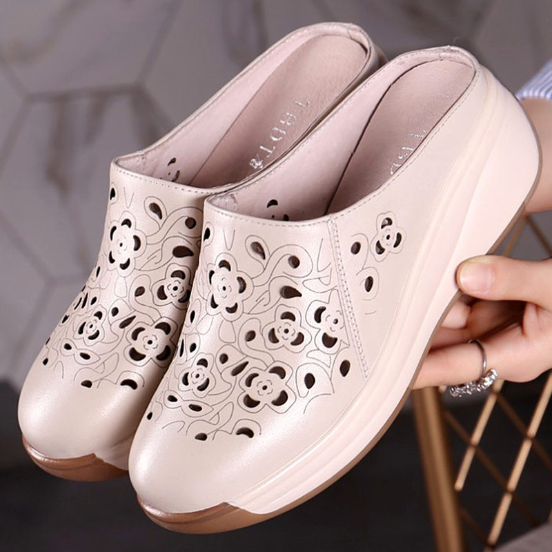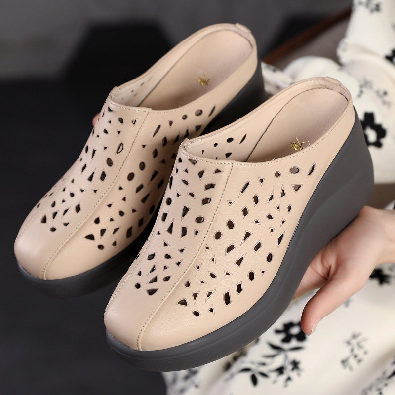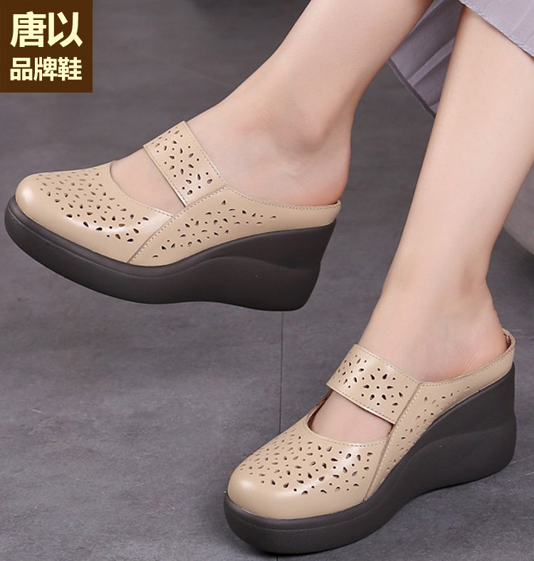 包头凉拖鞋女民族风透气镂空真皮坡跟中年增高厚底夏季米白妈妈鞋