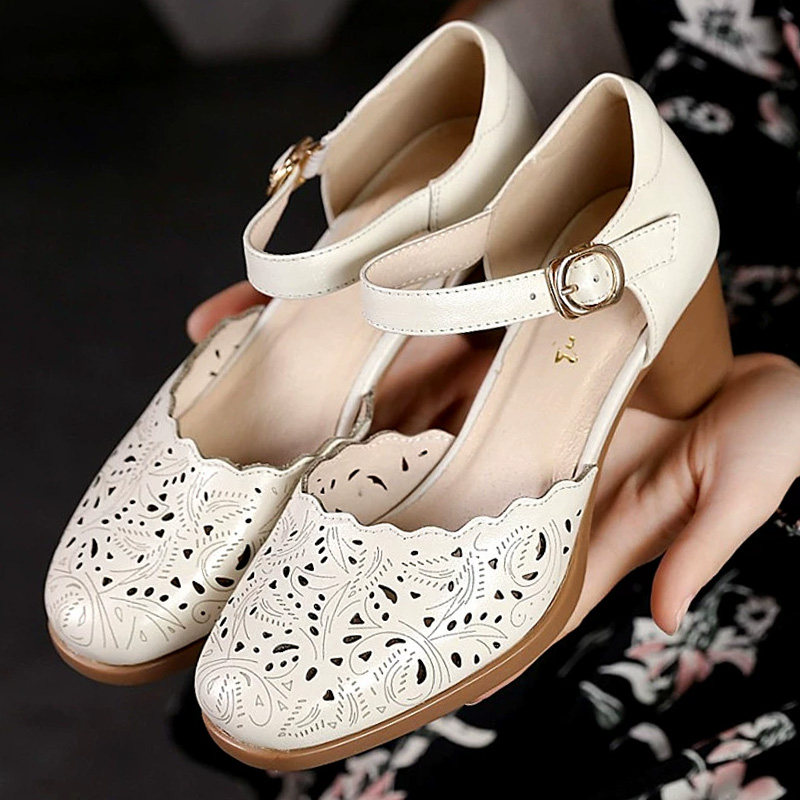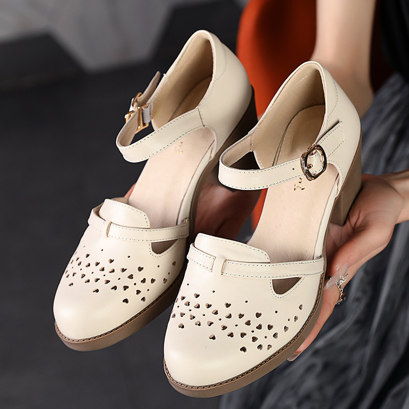 镂空女鞋真皮2025年夏新款凉鞋女软皮高跟一字扣连体跟中年妈妈鞋
