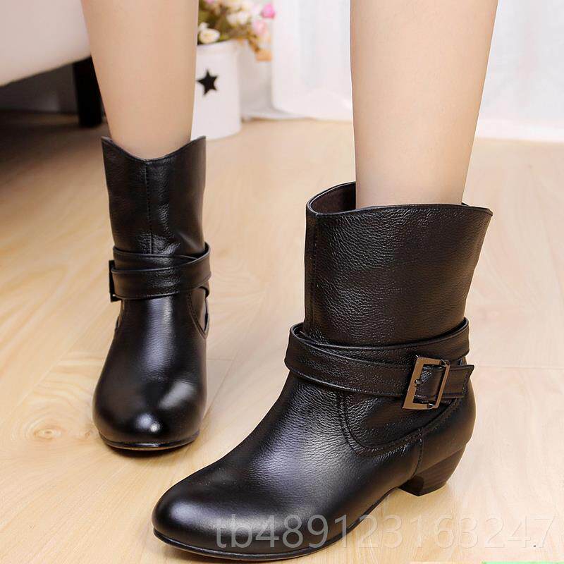 正品春秋短单靴低跟中筒女靴子休闲 丁套靴中年妈妈加绒棉靴真皮