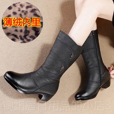 高档春秋单靴低跟靴中筒女子靴休闲 套筒短妈靴中年妈加绒棉真皮