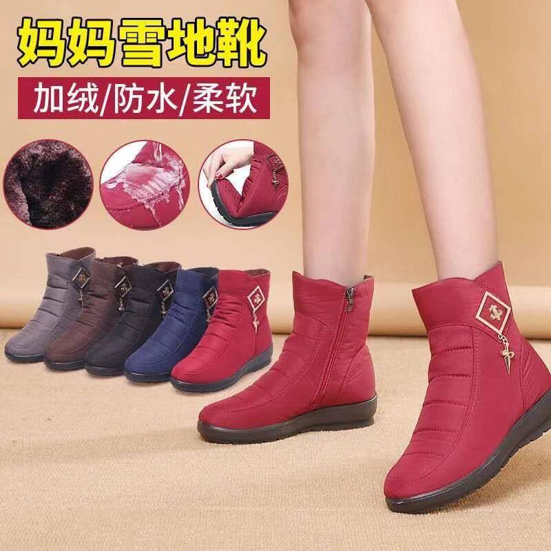 正品妈妈鞋加地靴子女冬加绒中筒靴防滑保老暖中年人女厚鞋平底棉