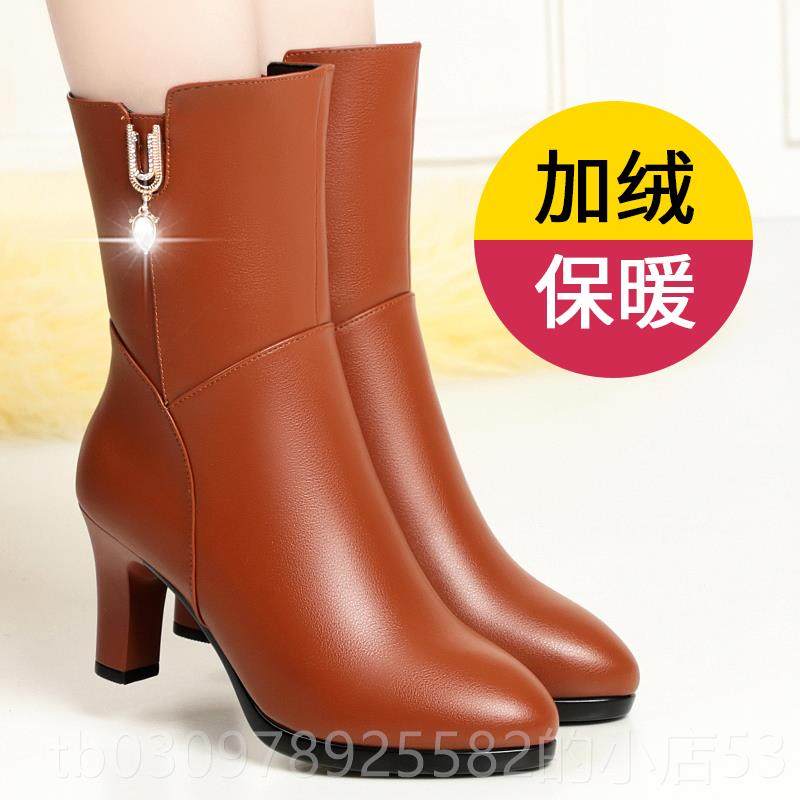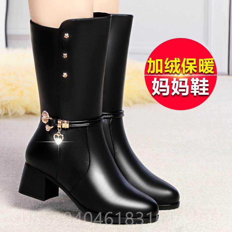 中年人妇女靴子秋冬季加绒半桶中跟皮鞋妈妈高跟中筒马靴中长冬天