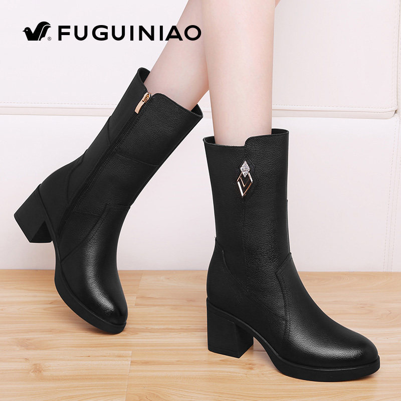富贵鸟中筒靴女粗跟棉鞋加绒保暖皮靴中年妈妈鞋冬季加厚中跟短靴