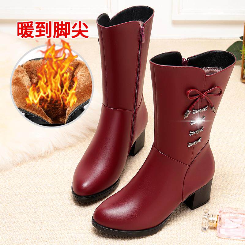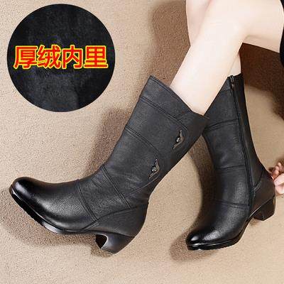 高档靴子女秋皮中筒靴女真士皮靴棉中年中跟粗跟中靴妈妈鞋大码女
