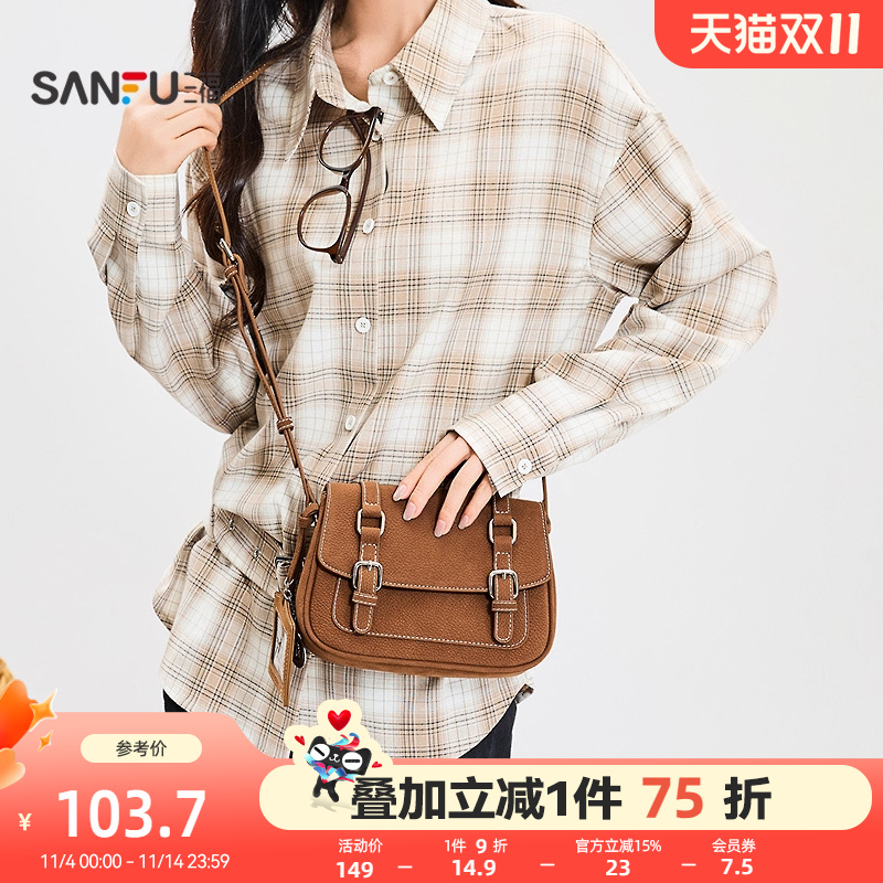 三福挎包秋季老钱风双扣翻盖包时尚简约纯色斜挎包女包507755