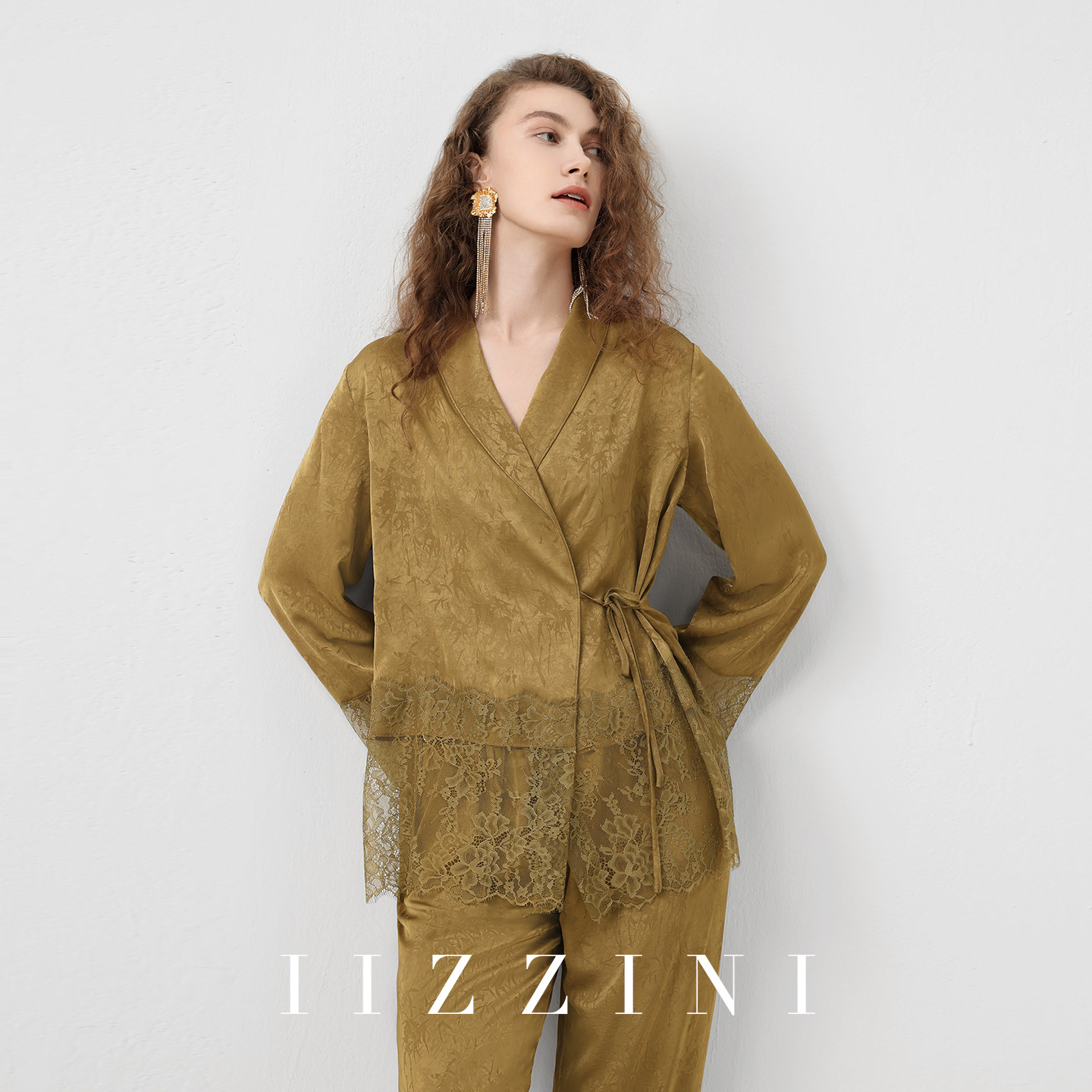 IIZZINI墨竹纹 家居服女春秋长袖冰丝复古系带轻奢外穿高级感套装