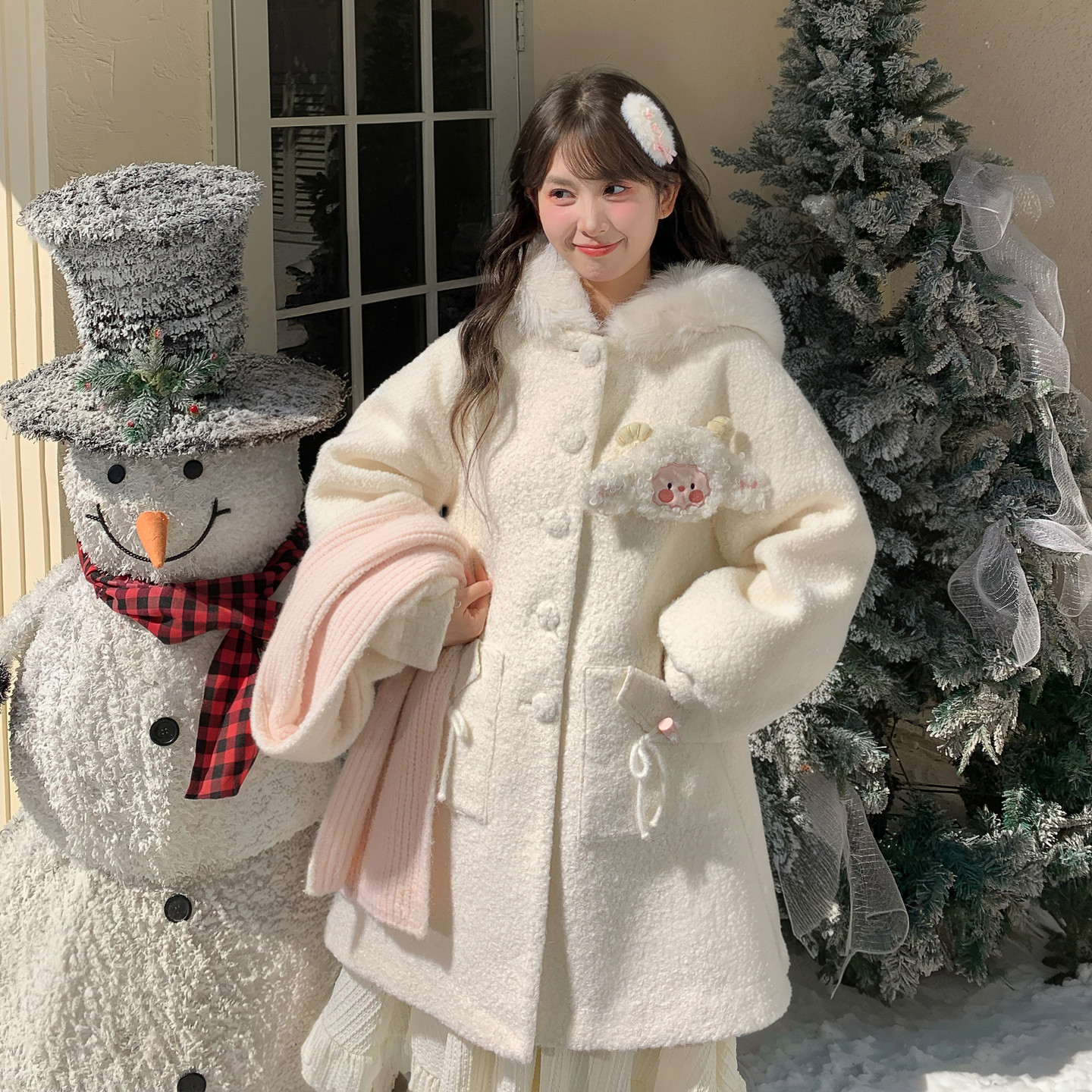 森女部落甜美萌趣羊耳连帽毛呢外套女新款设计感宽松长款大衣冬季