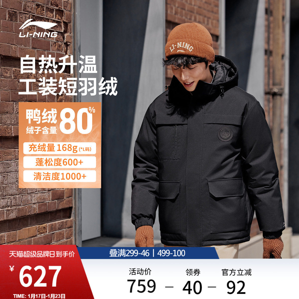李宁航天动态保暖羽绒服男冬季官方新款连帽衣服短款工装运动外套