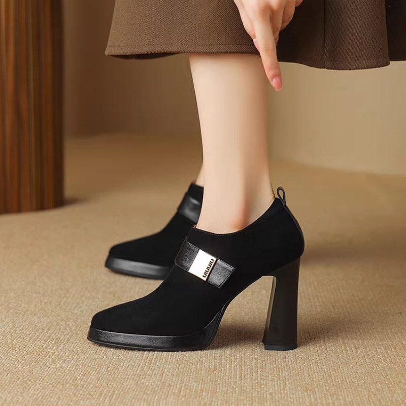 2025新款绒面粗跟高跟鞋秋冬加绒深口单鞋磨砂羊皮女鞋中跟真皮鞋