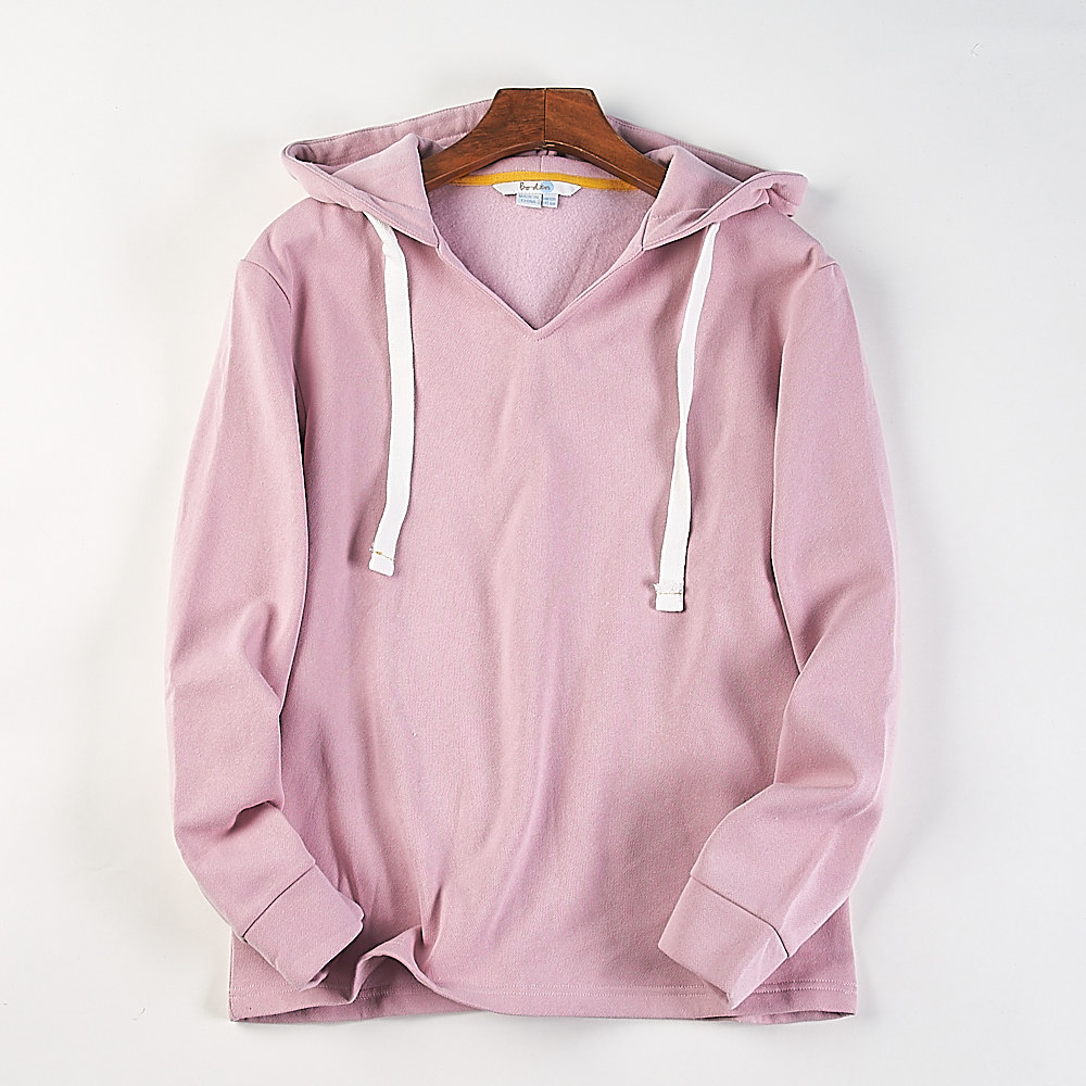 外贸大码女装纯色抓绒连帽卫衣H85067春秋冬宽松套头V领帽衫上衣