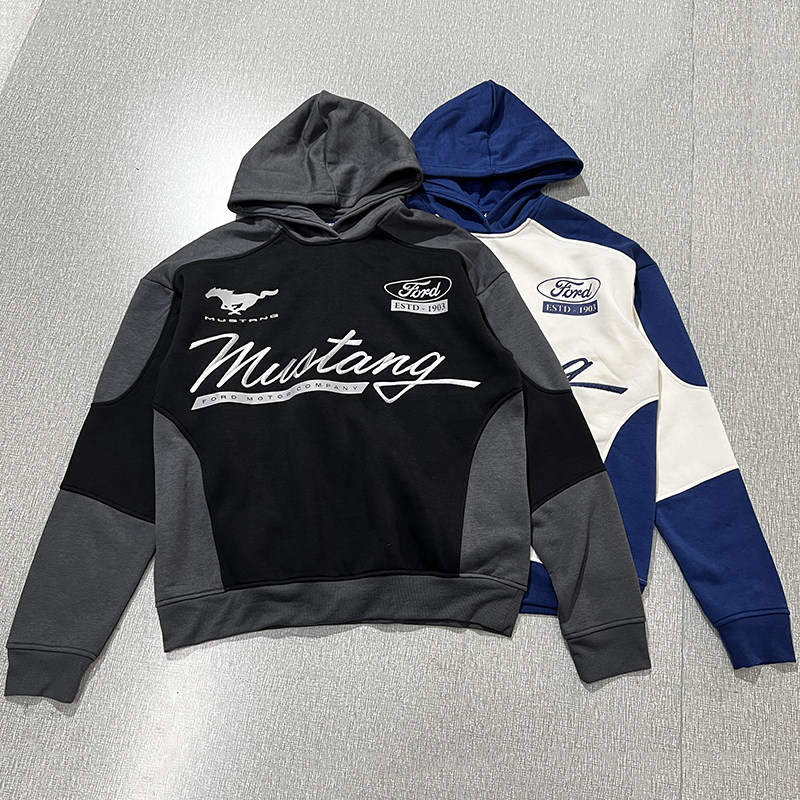 美式撞色刺绣柔软薄绒秋冬季宽松休闲胖大码连帽套头男女卫衣外贸