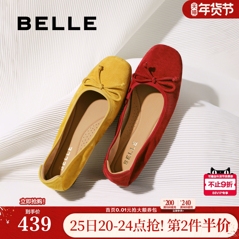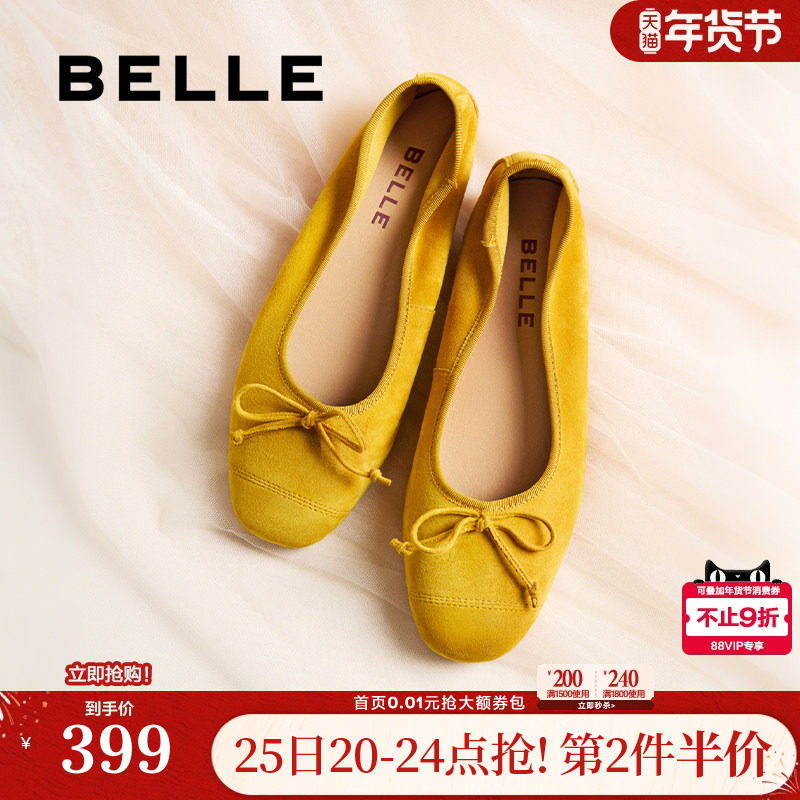 百丽舒芙蕾羊皮芭蕾红黄色平底单鞋女新款软底蛋卷鞋子E1E1DAQ6