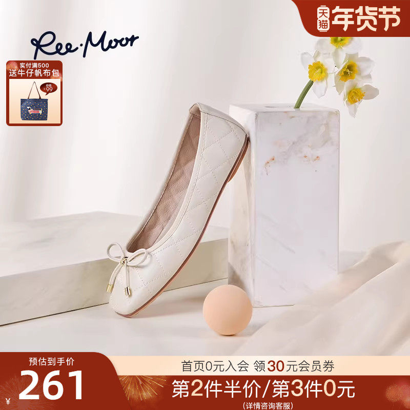 REEMOOR睿慕白色单鞋女2025新款芭蕾平底鞋浅口蛋卷鞋软底豆豆鞋