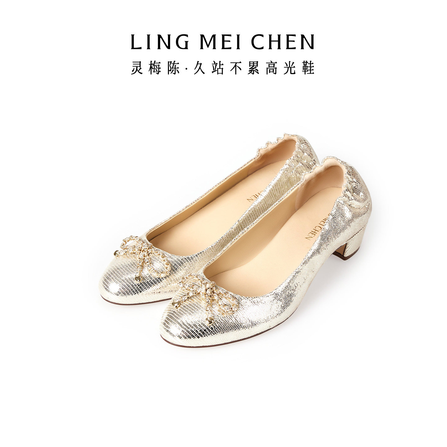 LINGMEICHEN芭蕾高跟鞋羊皮粗跟蛋卷鞋金色真皮单鞋圆头平底鞋女