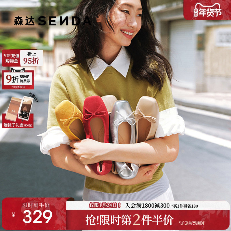 森达羊皮蛋卷鞋女春新商场同款超软平底浅口芭蕾红色玛丽珍单鞋女
