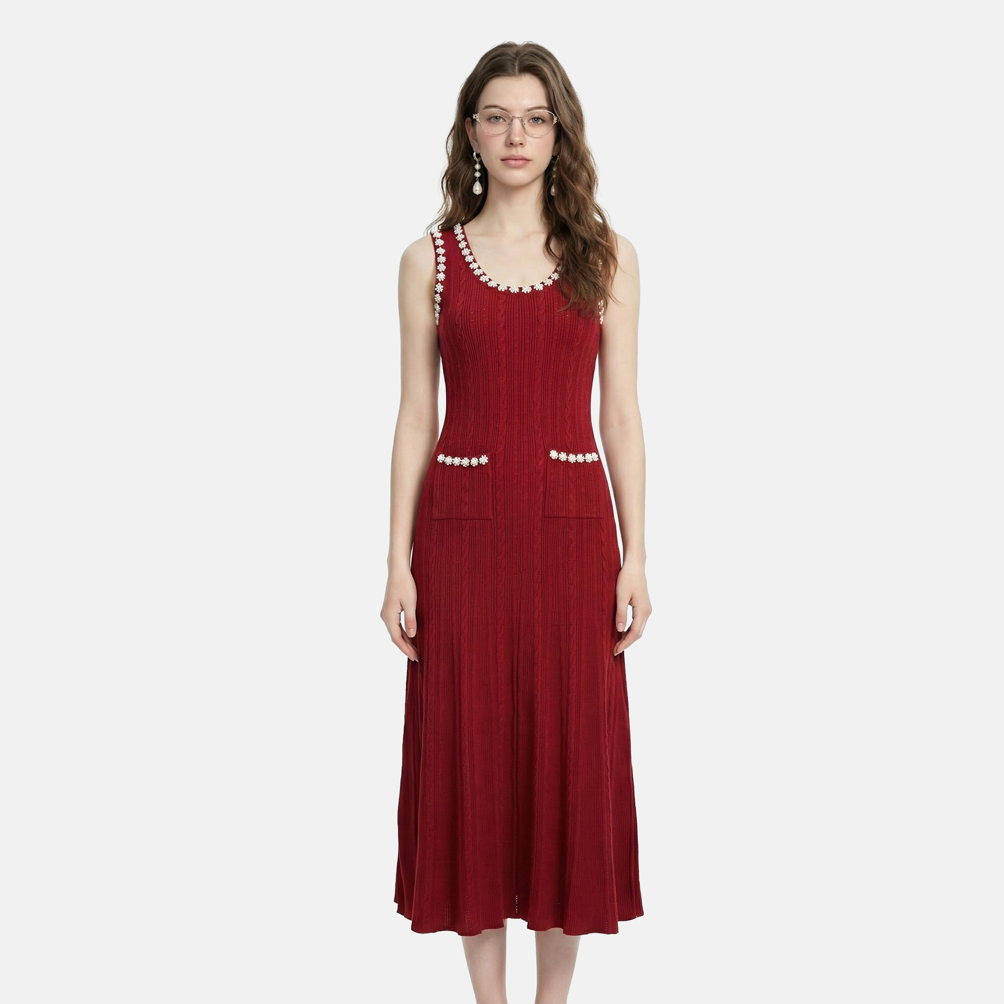 法式复古小雏菊赫本风针织连衣裙大摆长裙V领无袖背心裙名媛风女