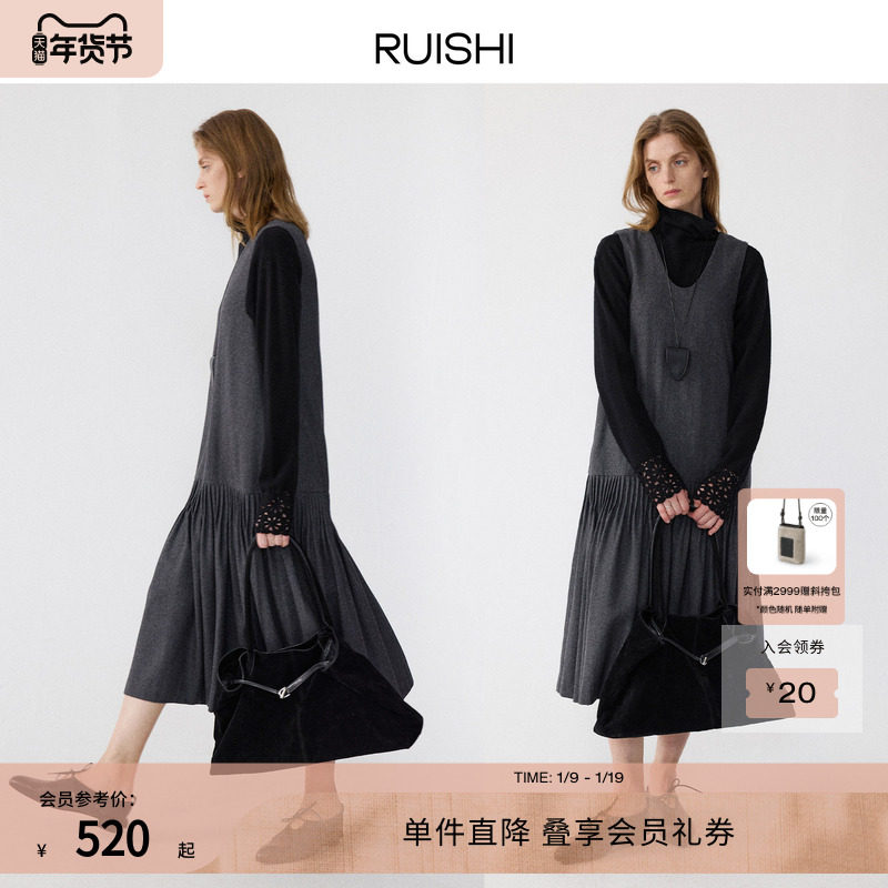 RUISHI芮时 手工塔克褶羊毛混色V领无袖背心裙A字显瘦连衣裙女冬