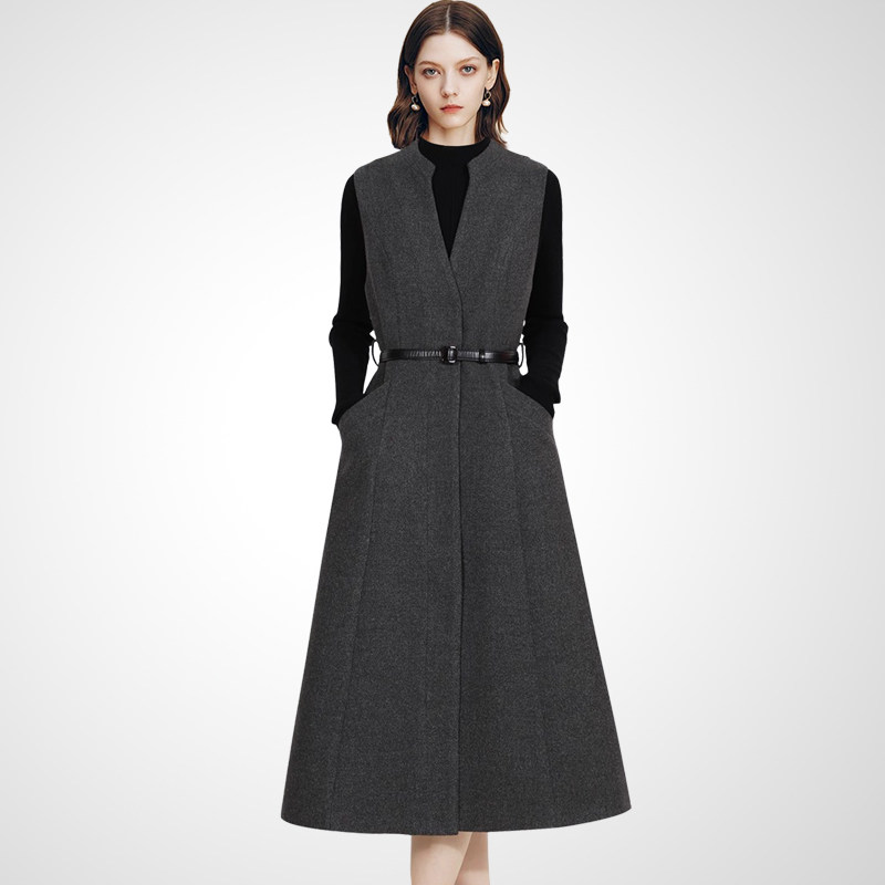 Maven Lin 优雅映现 100%羊毛V领无袖背心裙女气质双面毛呢连衣裙