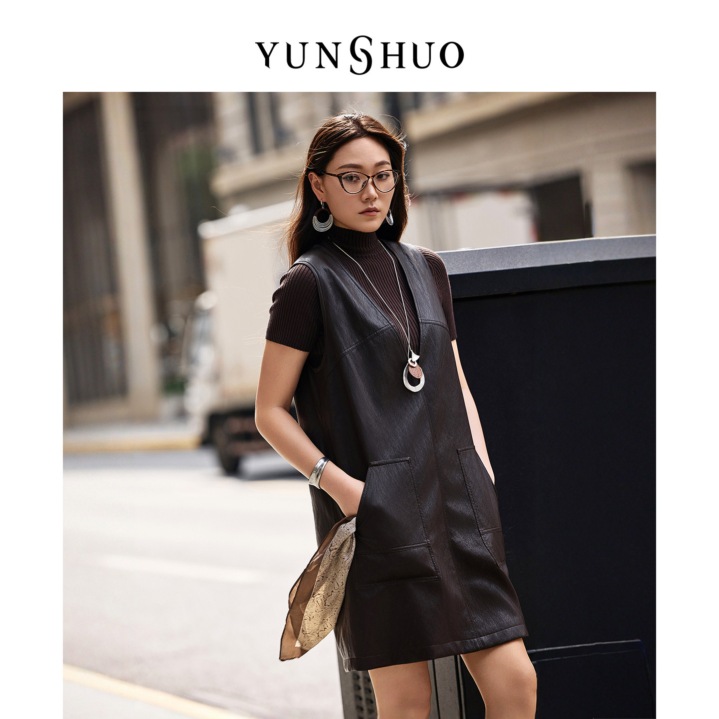 允硕新品琥珀复古风超柔蛋白皮连衣裙气质V领无袖背心裙女566428
