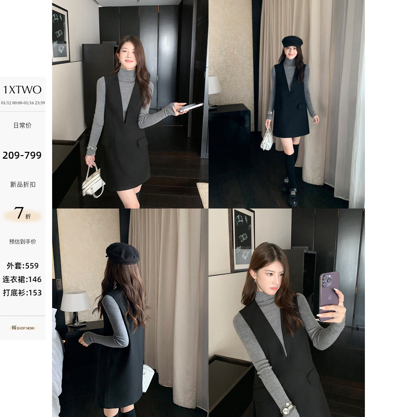 1XTWO 智性系列 气质叠穿深V领背心裙女秋冬通勤短款无袖连衣裙