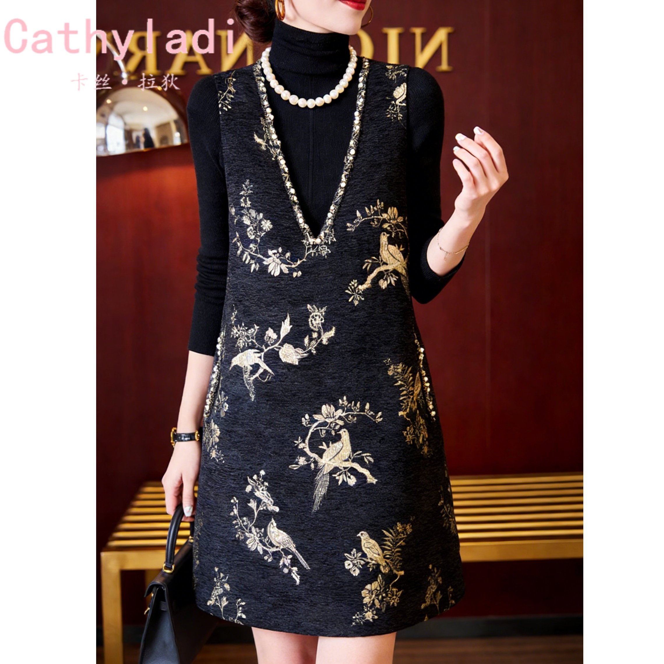 CATHYLADI时尚气质V领无袖背心裙2026年冬季百搭休闲中长款直筒裙