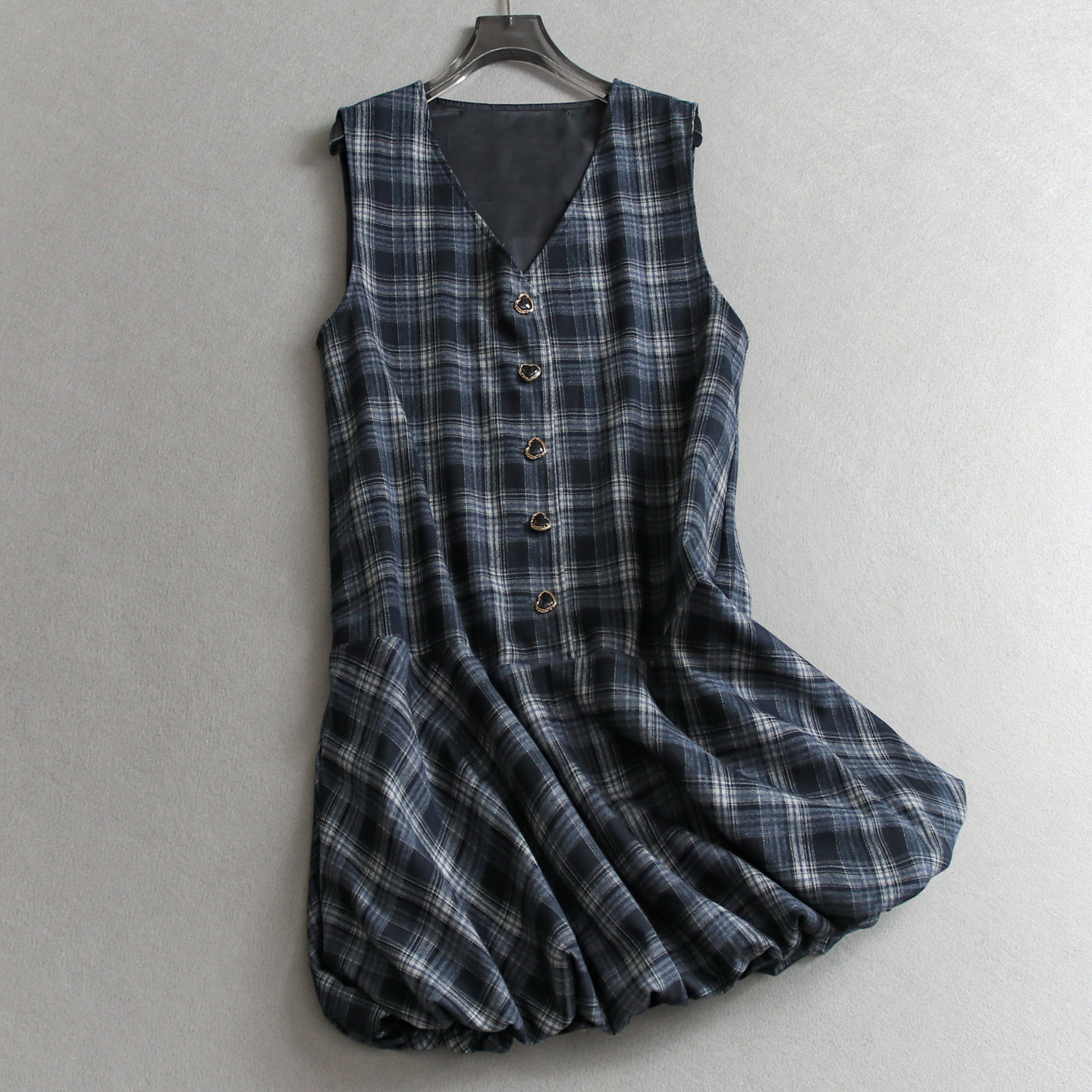 撞色格纹遮肉显瘦V领无袖背心裙叠穿短款花苞短裙女裙连衣裙M481